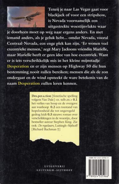 - « Desperation » is een paperback (230x150mm) van 604 pagina's die werd uitgegeven door Luitingh - Sijthoff in 1996. Oorspronkelijk kwam het boek uit in 1996 in de Verenigde Staten onder de titel « Desperation » bij uitgeverij Viking.