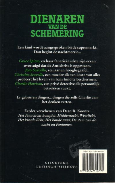 - « Dienaren Van De Schemering » is een paperback (210x135mm) van 380 pagina's die werd uitgegeven door Luitingh - Sijthoff in 1992. Oorspronkelijk kwam het boek uit in 1984 in de Verenigde Staten onder de titel « The Servants Of Twilight » bij uitgeverij Pocket Books.